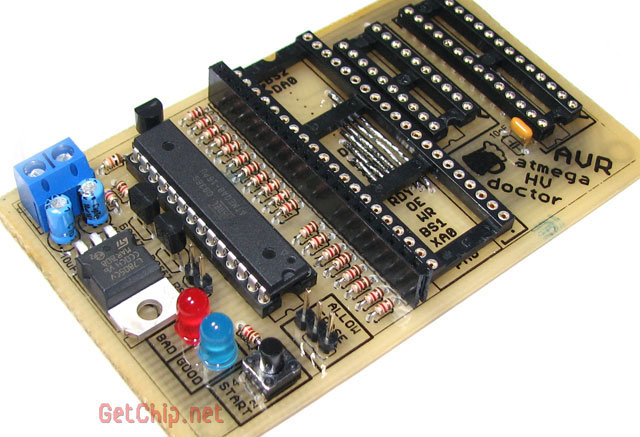 На плате установлены три панельки для «пациентов» на 20 (Attiny2313 …), 28 (Atmega48/88/168, Atmega8 …), 40 (Atmega16, Atmega8535 …) ножек. Если Вы решили «полечить» другого «пациента», то на плате предусмотрен специальный разъем для подключения адаптеров с панельками под любой, нужный Вам, микроконтроллер. Устройство поддерживает аж 106 типов микроконтроллеров AVR. Вот полный список: 1kB: AT90s1200, Attiny11, Attiny12, Attiny13/A , Attiny15 2kB: Attiny2313/A , Attiny24/A, Attiny26, Attiny261/A, Attiny28, AT90s2333, Attiny22, Attiny25 , AT90s2313, AT90s2323, AT90s2343 4kB: Atmega48, Atmega48P/A, Attiny461/A, Attiny43U, Attiny4313, Attiny44/A, Attiny48, AT90s4433, AT90s4414, AT90s4434, Attiny45 8kB: Atmega8515, Atmega8535, Atmega8, Atmega88 , Atmega88P/A, AT90pwm1, AT90pwm2, AT90pwm2B, AT90pwm3, AT90pwm3B, AT90pwm81, AT90usb82, Attiny861/A, Attiny87, Attiny88, Attiny85 , AT90s8515, AT90s8535 16kB: Atmega16/A , Atmega16U2, Atmega16U4, Atmega16M1, Atmega161, Atmega162, Atmega163, Atmega164, Atmega164P/A, Atmega165/P/A/PA, Atmega168 , Atmega168P/A, Atmega169/P/A/PA, Attiny167, AT90pwm216, AT90pwm316, AT90usb162 32kB: Atmega32/A , Atmega32C1, Atmega323/A, Atmega32U2, Atmega32U4, Atmega32U6, Atmega32M1, Atmega324, Atmega324P/A, Atmega325, Atmega3250, Atmega325P, Atmega3250P, Atmega328, Atmega328P, Atmega329, Atmega3290, Atmega329P, Atmega3290P, AT90can32 64kB: Atmega64/A, Atmega64C1, Atmega64M1, Atmega649, Atmega6490, Atmega640, Atmega644, Atmega644P/A, Atmega645, Atmega6450, AT90usb646, AT90usb647, AT90can64 128kB: Atmega103, Atmega128/A, Atmega1280, Atmega1281, Atmega1284, Atmega1284P, AT90usb1286, AT90usb1287, AT90can128 256kB: Atmega2560, Atmega2561