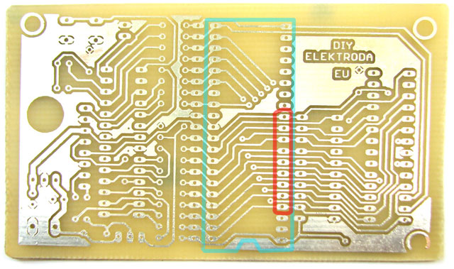 Плата устройства разведена хорошо, но есть один нюанс, о котором важно не забыть при сборке устройства. Ножки 40-ка пиновой панельки с 29 по 37 необходимо откусить (лучше в плате вообще не сверлить отверстия под эти ножки).