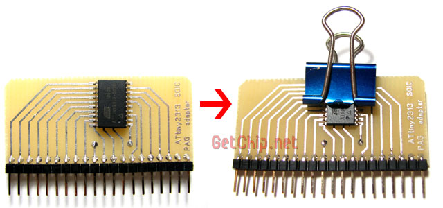Небольшой бонус от меня – адаптеры для микроконтроллеров 8-ми пиновых (ATtiny13 …) и 20-ти пиновых (ATtiny2313 …) в корпусах SOIC.