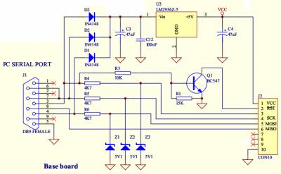 В данном случае питание микроконтроллера осуществляется от сигнальних линий COM порта. В большинстве случаев в современных компьютеров порт не может обеспечить необходимый для питания микроконтроллера уровень напряжения по-этому рекомендую выбросить из схемы диоды D1-D3 и подать на вход 1 стабилизатора напряжения LM2936Z-5 напряжение с внешнего источника (6-12В). Стабилитроны Z1-Z3 необходимы для согласования уровней напряжения COM порта и микроконтроллера (так как COM порт оперирует напряжением -12/12В, а микроконтроллер - 0/+5В). Линия 2 в разъеме J2 используется для подключения и отключения напряжения на ножке RESET микроконтроллера. Для работы программатора, кроме элементов, указанных на данной схеме, необходимо подтянуть ножку RESET микроконтроллера через резистор 10кОм к питанию.